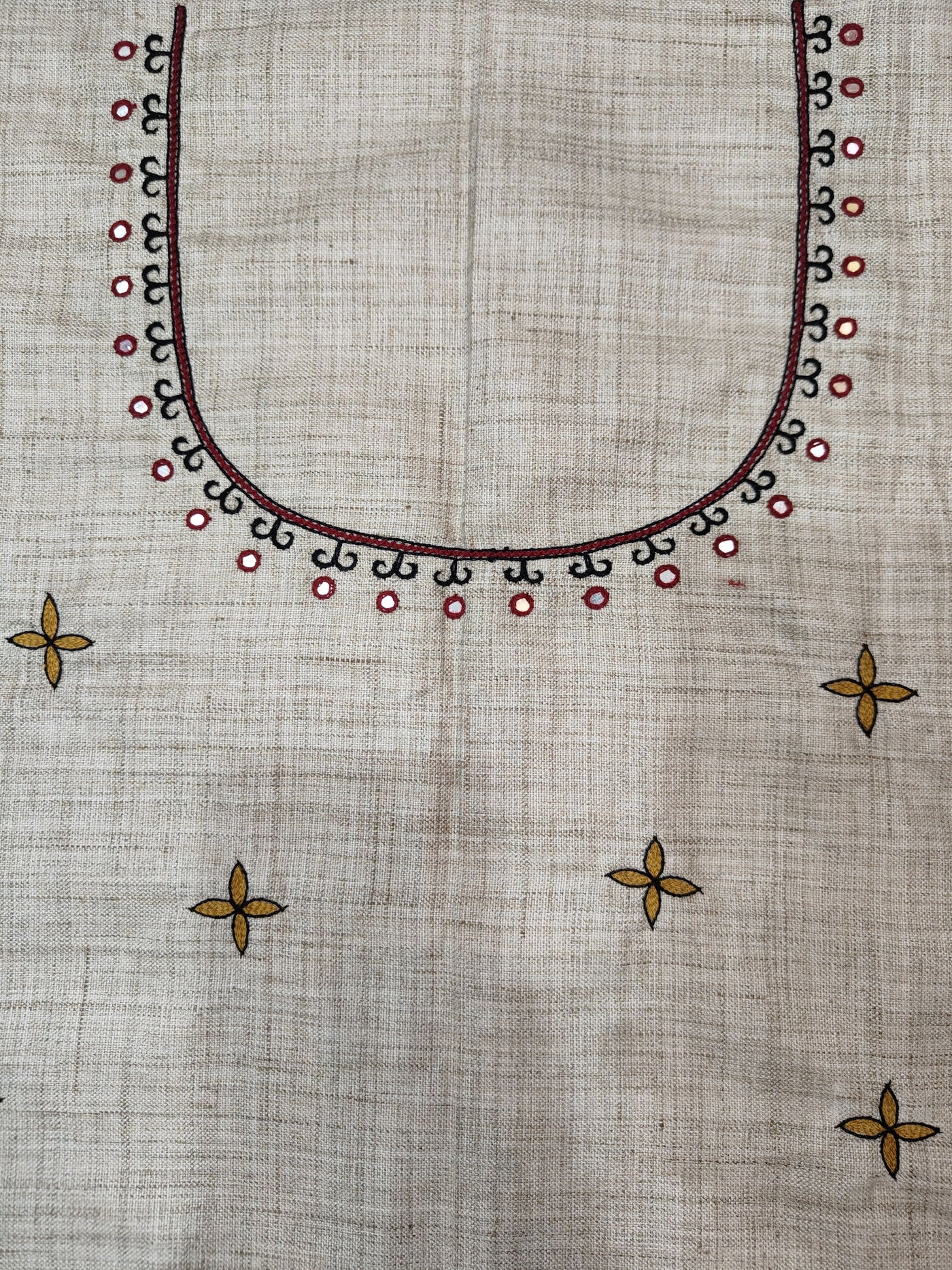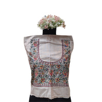Discover the perfect blend of tradition and comfort with our unstitched blouse piece, crafted on breathable Pure Cotton in a serene, natural beige color. Featuring intricate hand-painted Madhubani art, this blouse piece is a testament to timeless craftsmanship. The exquisite design centers around the U-shaped neckline, with a detailed panel showcasing traditional motifs including stylized human figures in a central arch, vibrant peacocks, and lush foliage, making it a stunning choice for any occasion.