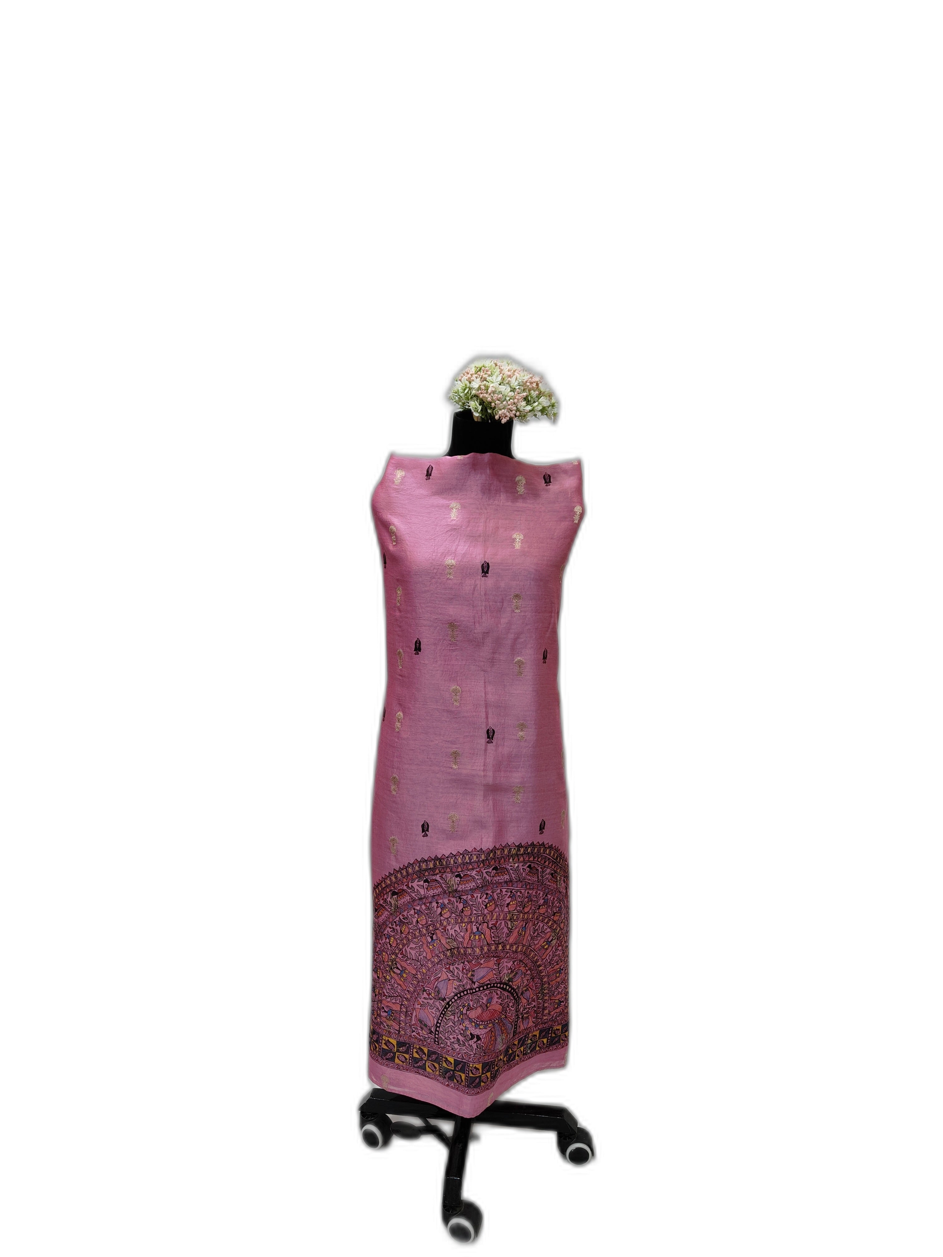 Hand-Painted Madhubani Unstitched Chanderi Suit Set with Organza Dupatta – Elegance in Pink and Zari
