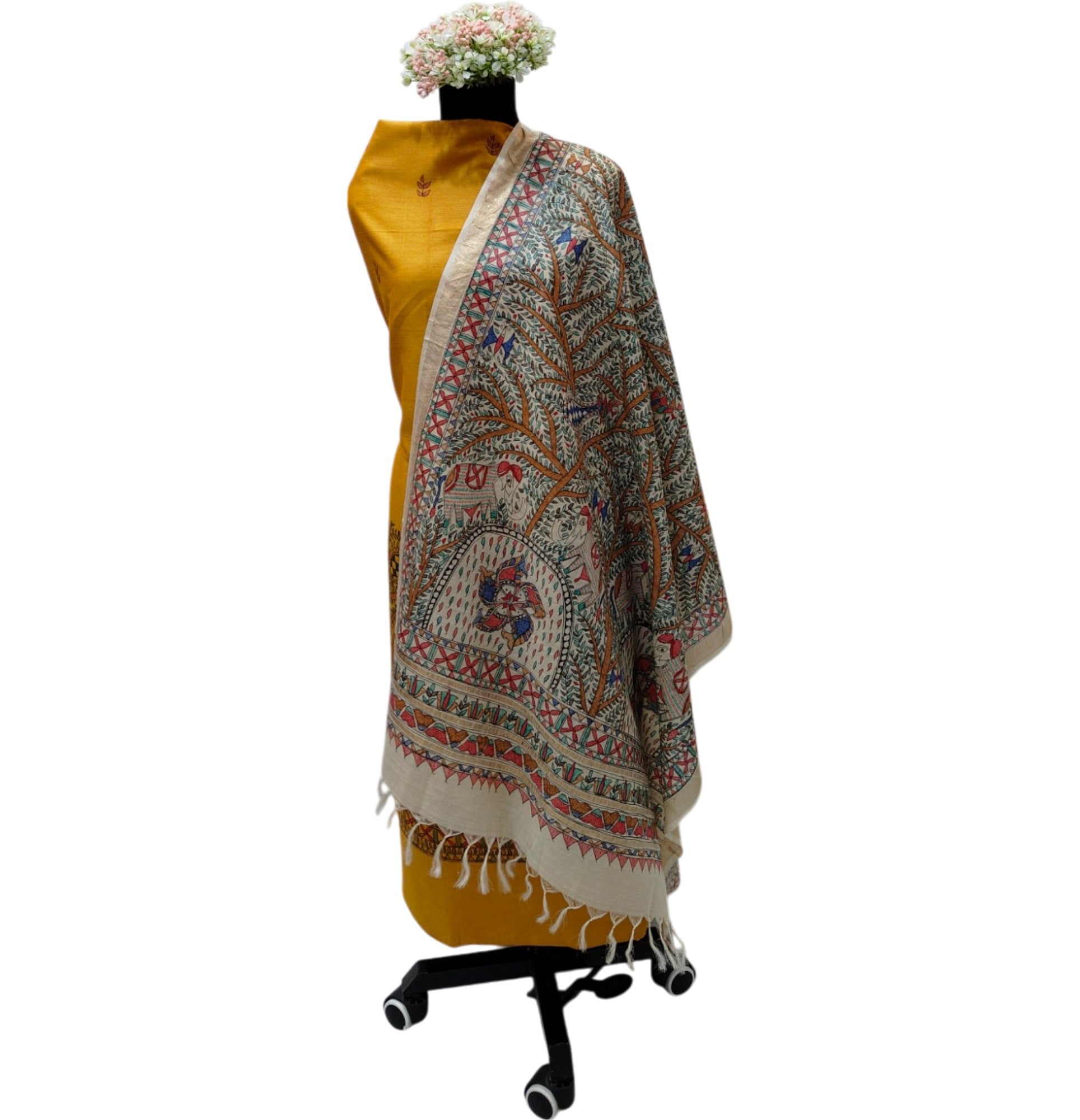 Hand-Painted Madhubani Unstitched Tussar Munga Silk Suit Set in Mustard and Natural Tussar – A Forest-Inspired Masterpiece