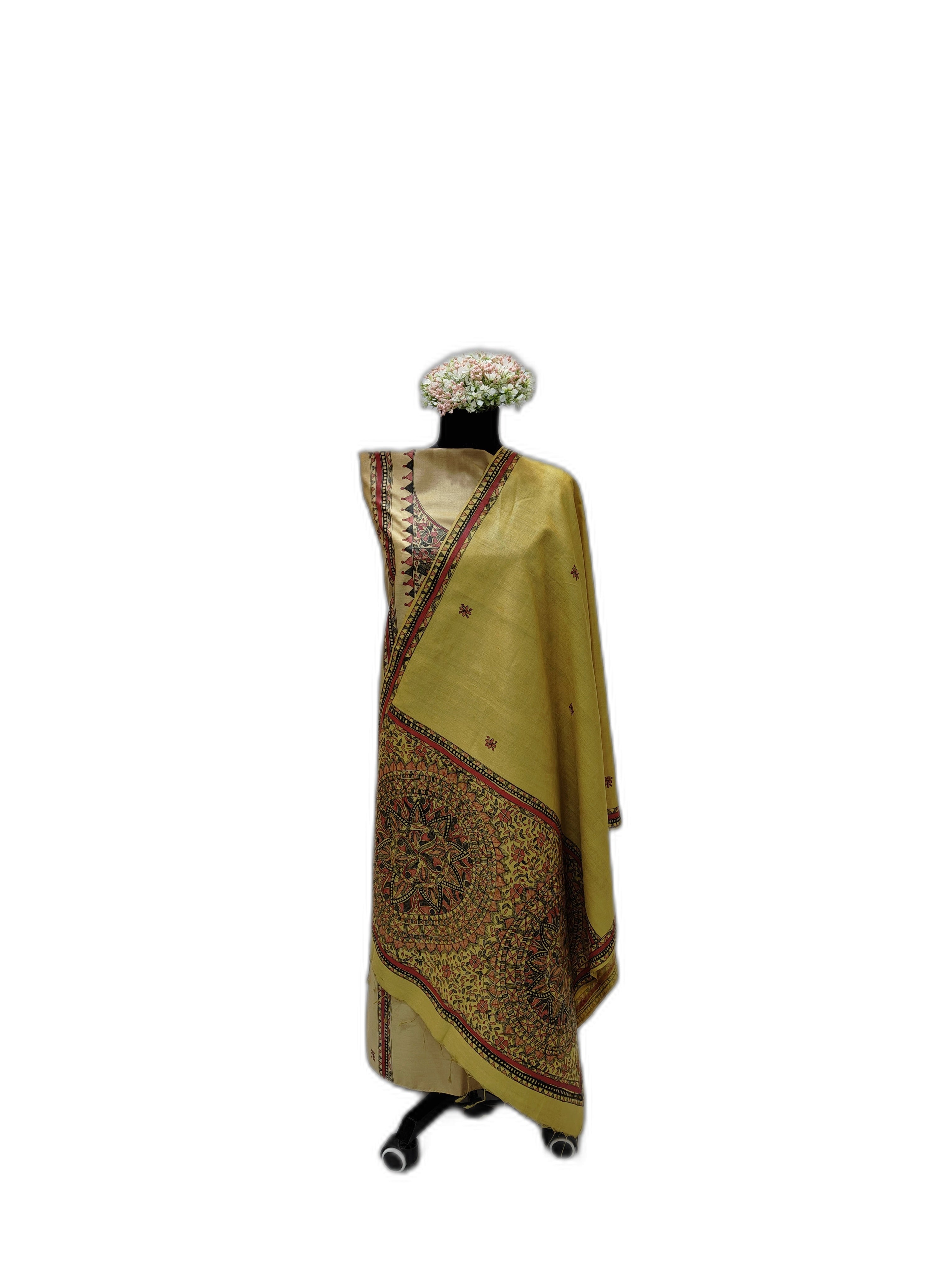 Unstitched Hand-Painted Madhubani Tussar Munga Silk Suit Set – Artistry in Mustard Elegance